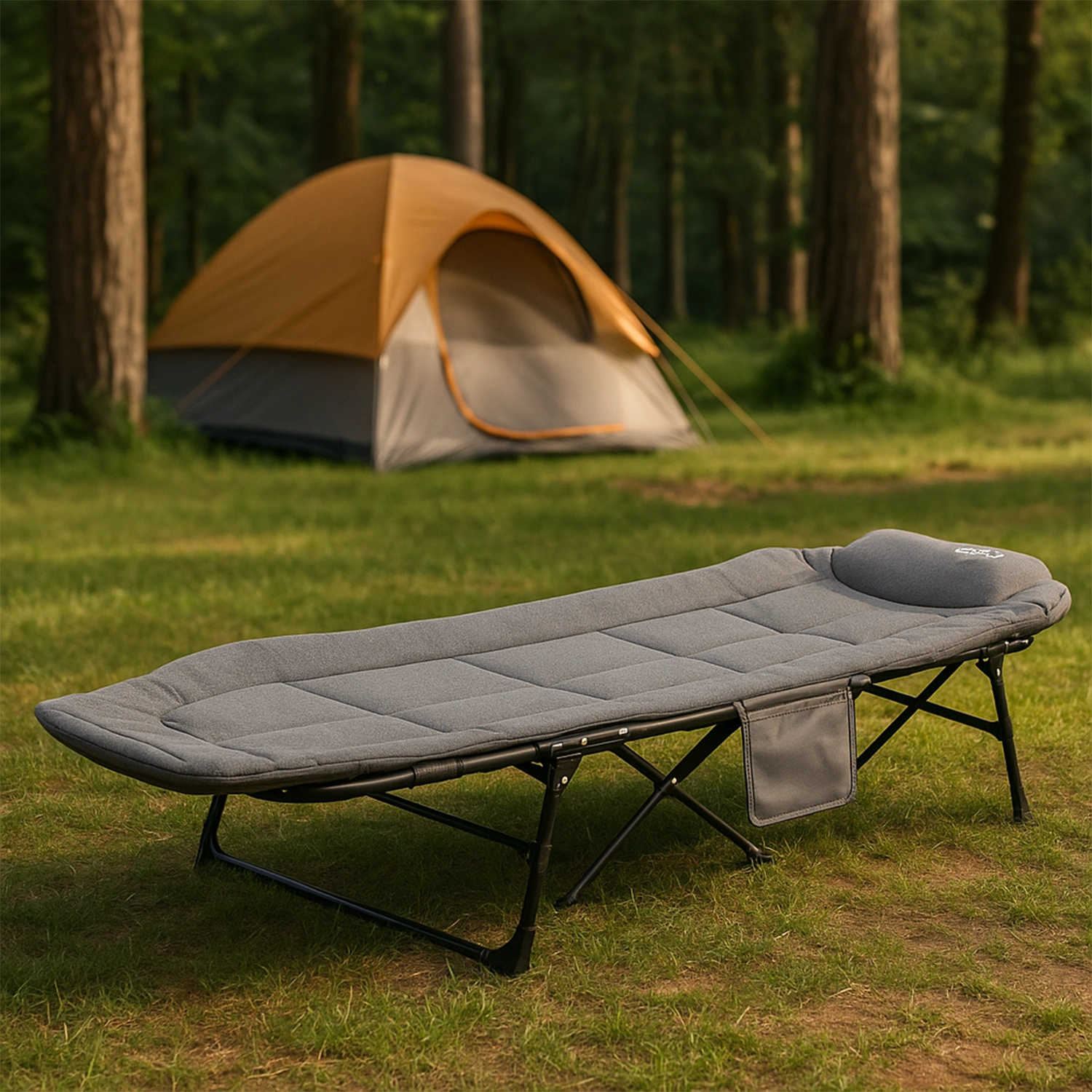 Cama Plegable de Camping Acolchada, diseñada para ofrecer un descanso superior en tus aventuras al aire libre. Con estructura de tubo de hierro resistente y superficie en poliéster 600D acolchado, combina durabilidad y comodidad, soportando hasta 120 kg de peso.