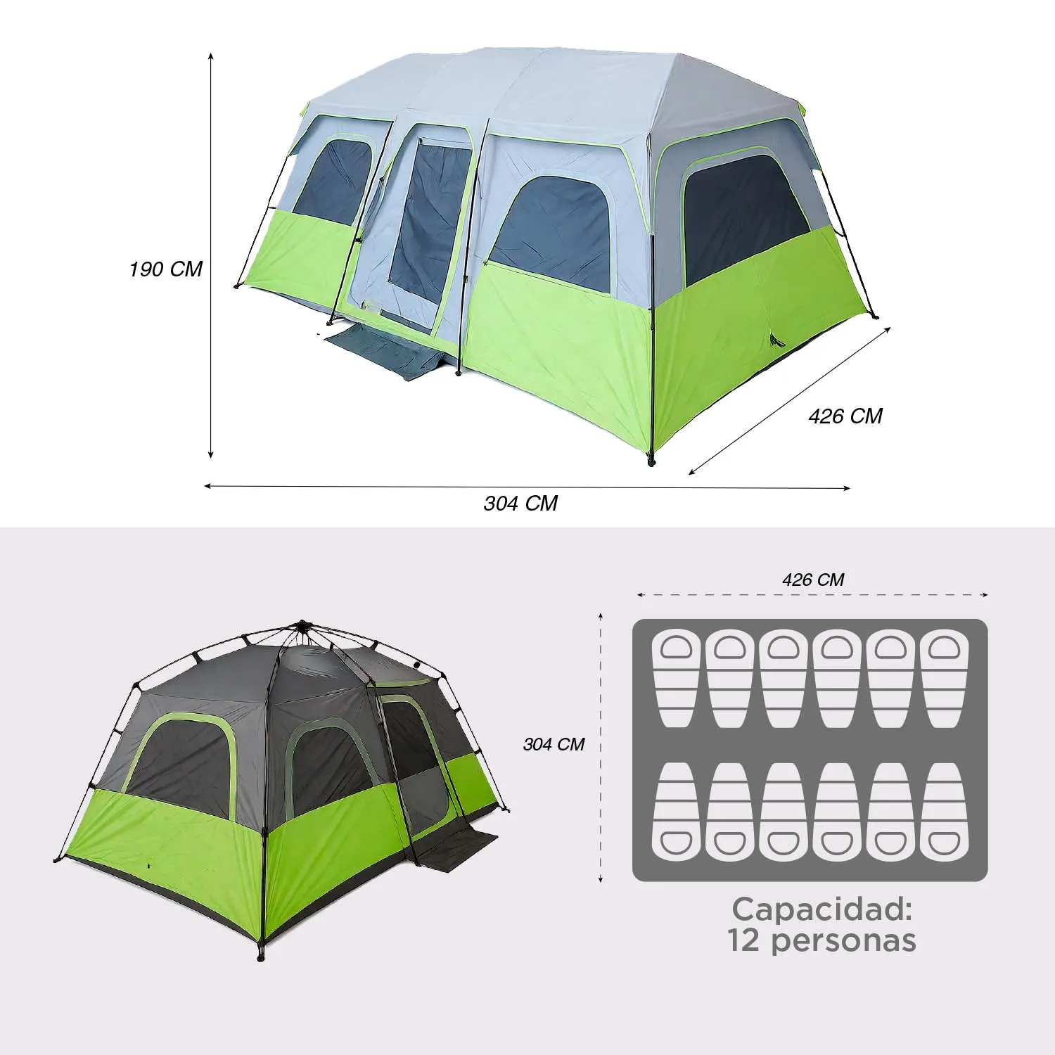 La carpa instantánea QuickCamp 12 personas es la opción más amplia de la línea, pensada para familias grandes o grupos que buscan mucho espacio interior, armado rápido y un excelente nivel de protección frente a la lluvia. Su estructura de acero autoportante permite montar la carpa de manera sencilla y estable, mientras la tela de polietileno 210T con revestimiento PU3000 mm ofrece un resguardo confiable en noches húmedas y jornadas lluviosas. Con 2 habitaciones, facilita separar zonas de descanso y equipaje, haciendo el campamento más cómodo, ordenado y funcional.