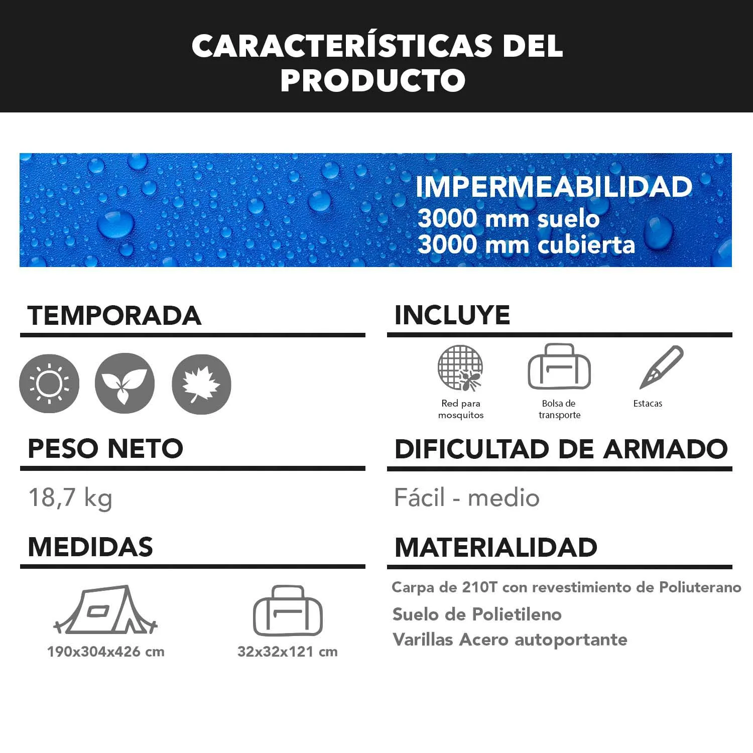 La QuickCamp 12P es ideal para camping familiar prolongado, viajes con varios amigos, salidas a playa, lagos, bosques o montaña, donde se necesita un refugio grande, cómodo y fácil de usar. Su sistema instantáneo reduce al mínimo el tiempo de armado, algo clave cuando se llega tarde al camping o se viaja con niños. Las 2 habitaciones permiten separar grupos, crear un dormitorio principal y otro secundario o destinar una sección al almacenamiento de equipaje y equipo. El revestimiento PU3000 mm proporciona una muy buena protección ante lluvia y humedad, mientras la mosquitera mejora la ventilación y ayuda a mantener alejados los insectos. La estructura de acero autoportante aporta solidez y estabilidad frente al viento, acompañando mejor en climas cambiantes. La carpa instantánea QuickCamp 12 personas combina gran capacidad interior, 2 habitaciones, estructura de acero autoportante y protección PU3000 mm, transformándose en una excelente compañera para disfrutar del camping en grupo con más confort, espacio y resguardo climático.