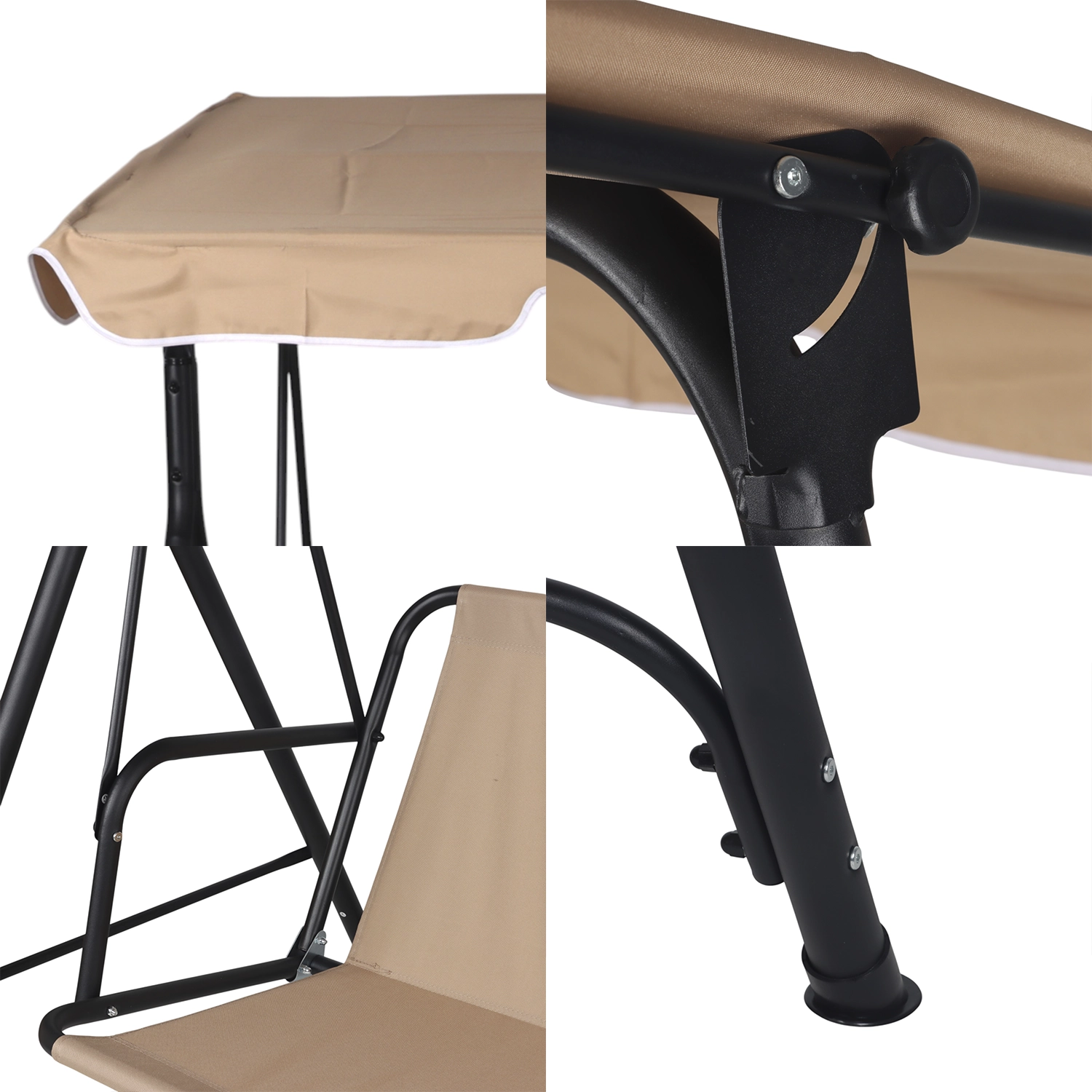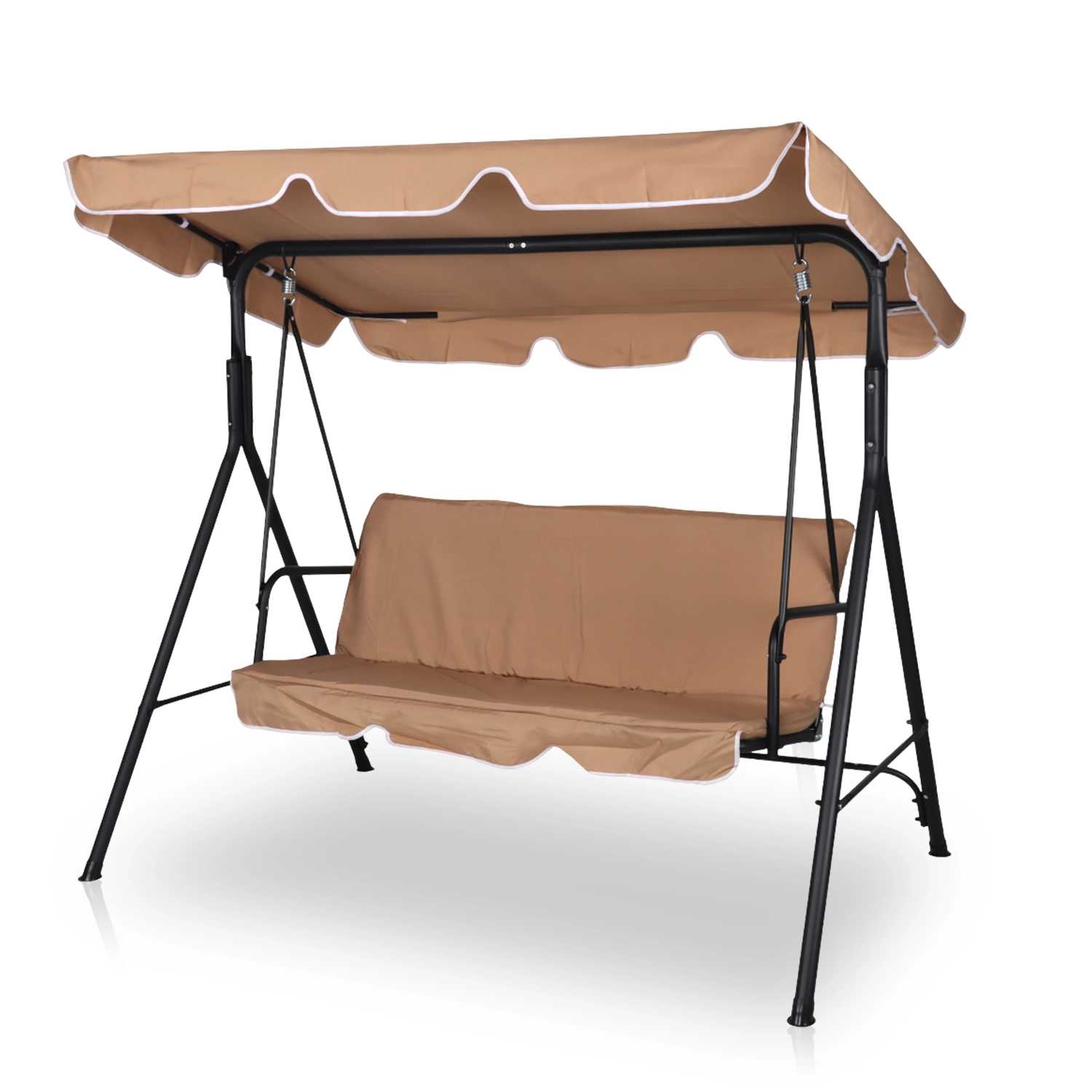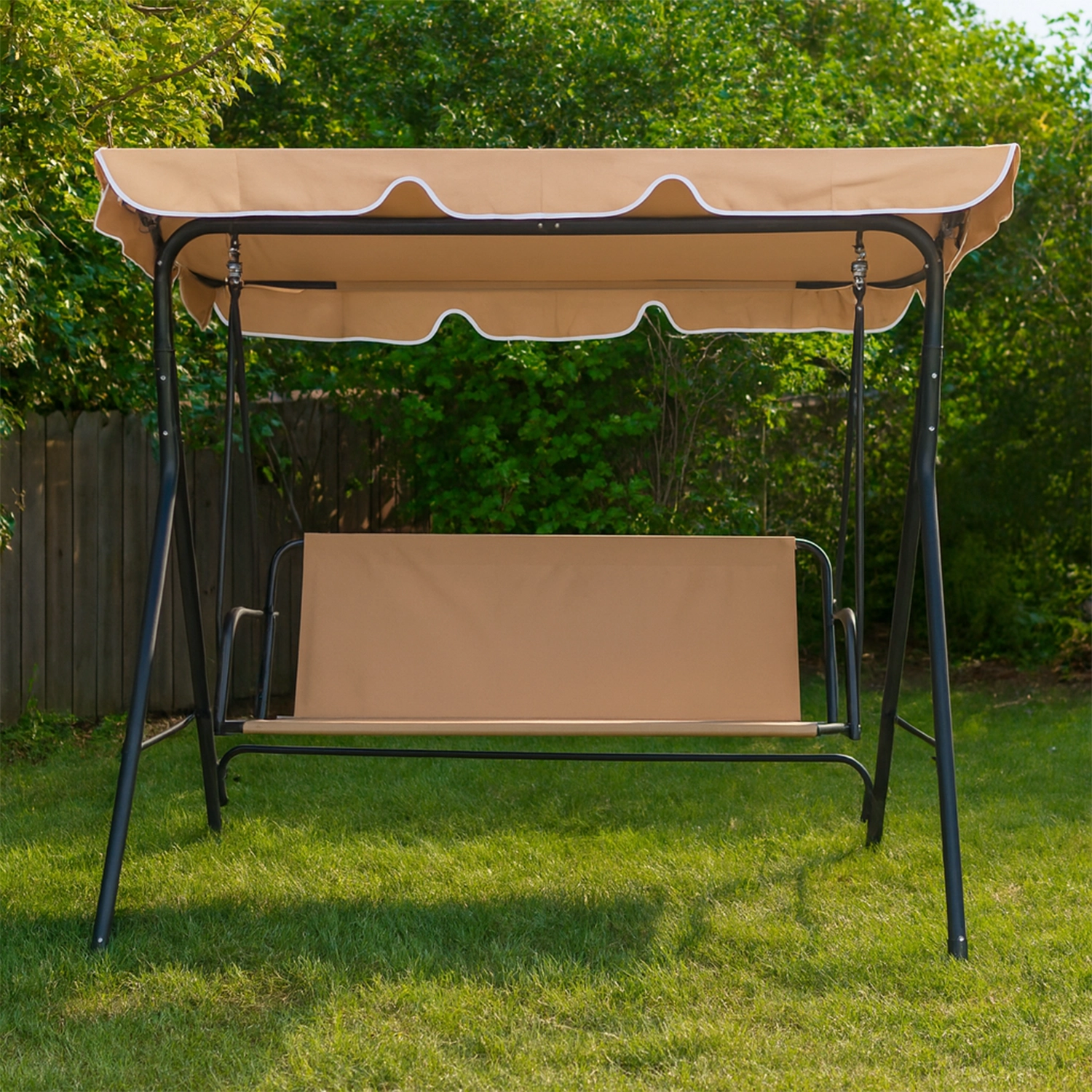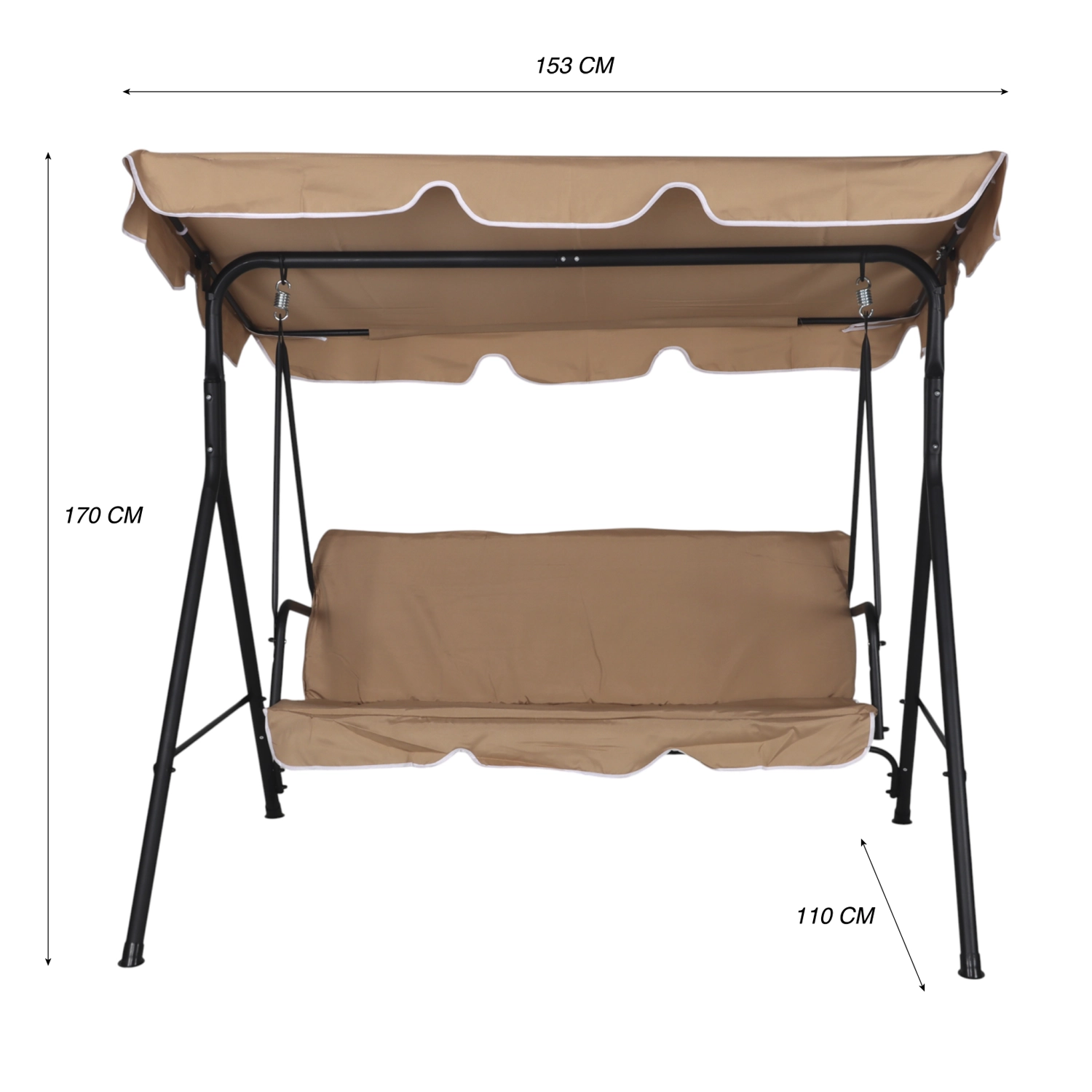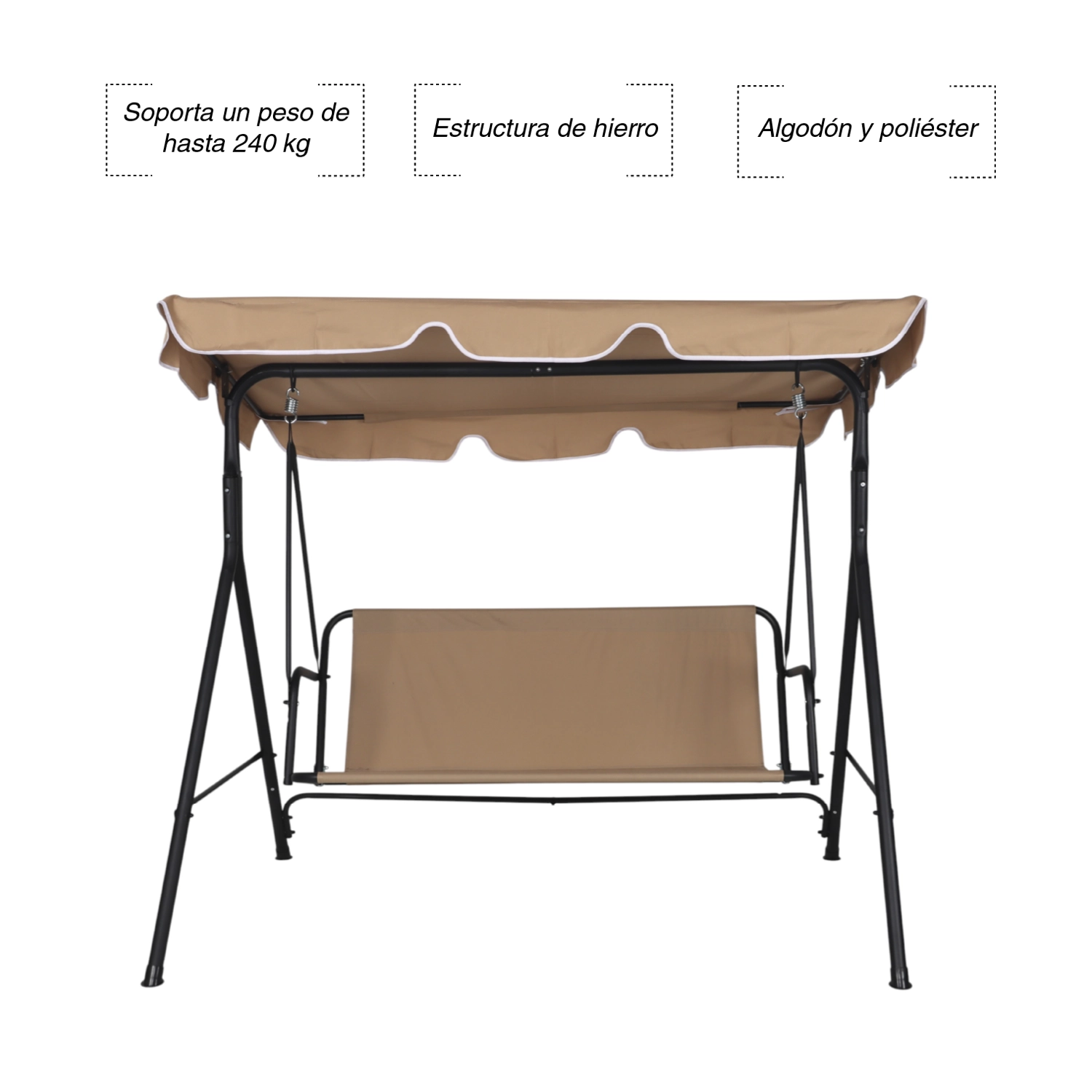 Su estructura de tubo de hierro brinda firmeza y durabilidad, mientras que el asiento y respaldo en poliéster con relleno de algodón PP garantizan suavidad y comodidad. Además, es hipoalergénico, lo que asegura un uso prolongado y seguro. Incluye un techo protector que ofrece sombra en días soleados, convirtiéndolo en el complemento perfecto para jardines, terrazas, balcones o camping.
